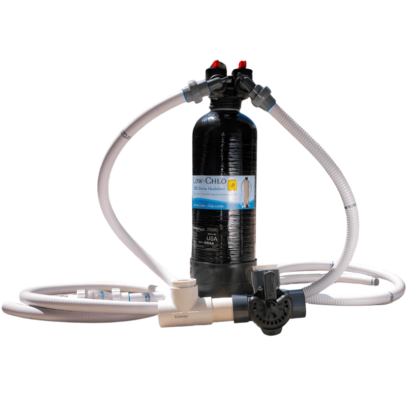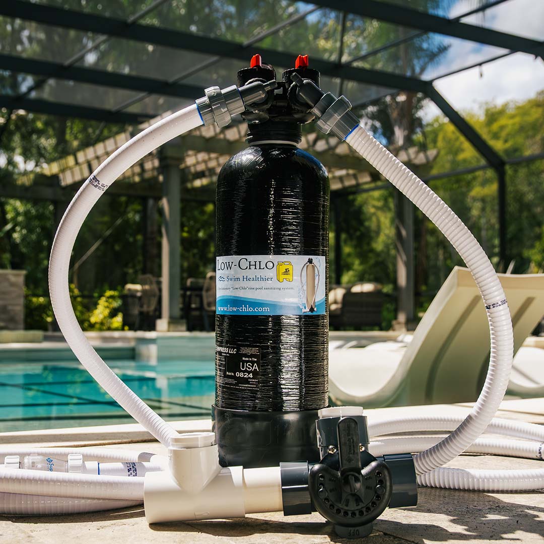 Low-Chlo is a patented pool sanitizer that uses a proprietary metallic media inside a tank plumbed after your filter to kill bacteria, algae, and viruses as water circulates. It reduces chlorine in the pool to very low levels—typically less than 1 part per million—while still keeping the water safe and clean. Think of it as bringing commercial-grade water treatment technology into a residential backyard pool without adding electronics or salt cells.